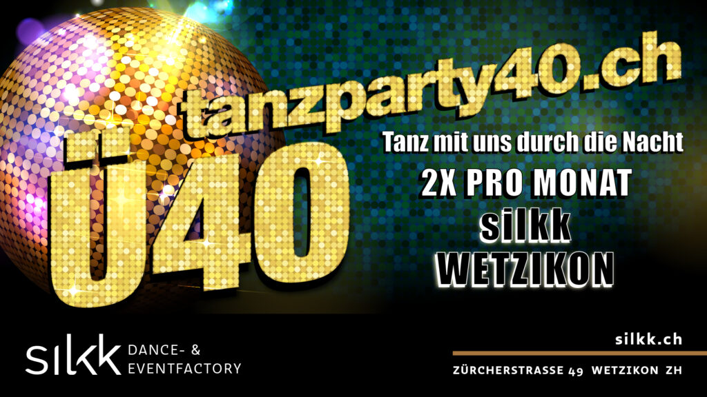 Tanzparty40.ch – Seit Jahren ein Garant für atemberaubende und durchgetanzte Nächte einer lebendigen Ü40 Generation. Ob mit Freunden in der reservierten Lounge, als Paar für einen feinen Cocktail an der Bar oder als Single auf der Tanzfläche, bei uns ist jeder willkommen. Getanzt wird zu Musik aus den 70er über die 80er & 90er bis hin zu den aktuellen Charts, serviert von den angesagtesten Ü40 DJ’s des Landes. Kommt vorbei und seid Teil der kultigsten Ü40 Party-Bewegung der Region – wir freuen uns auf Euch.